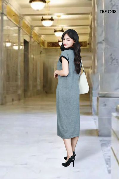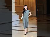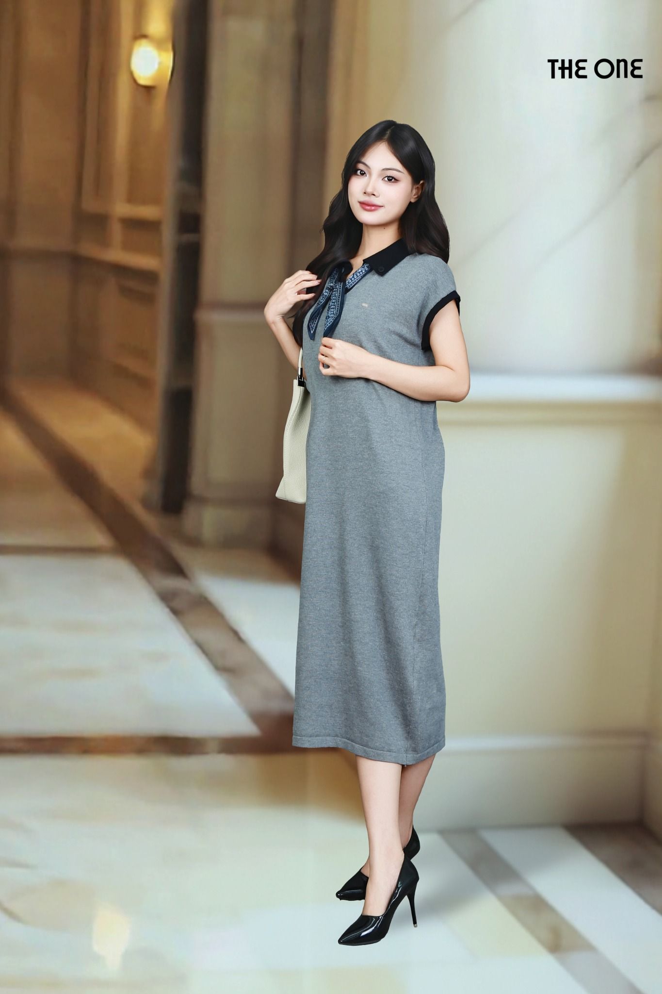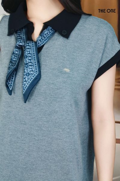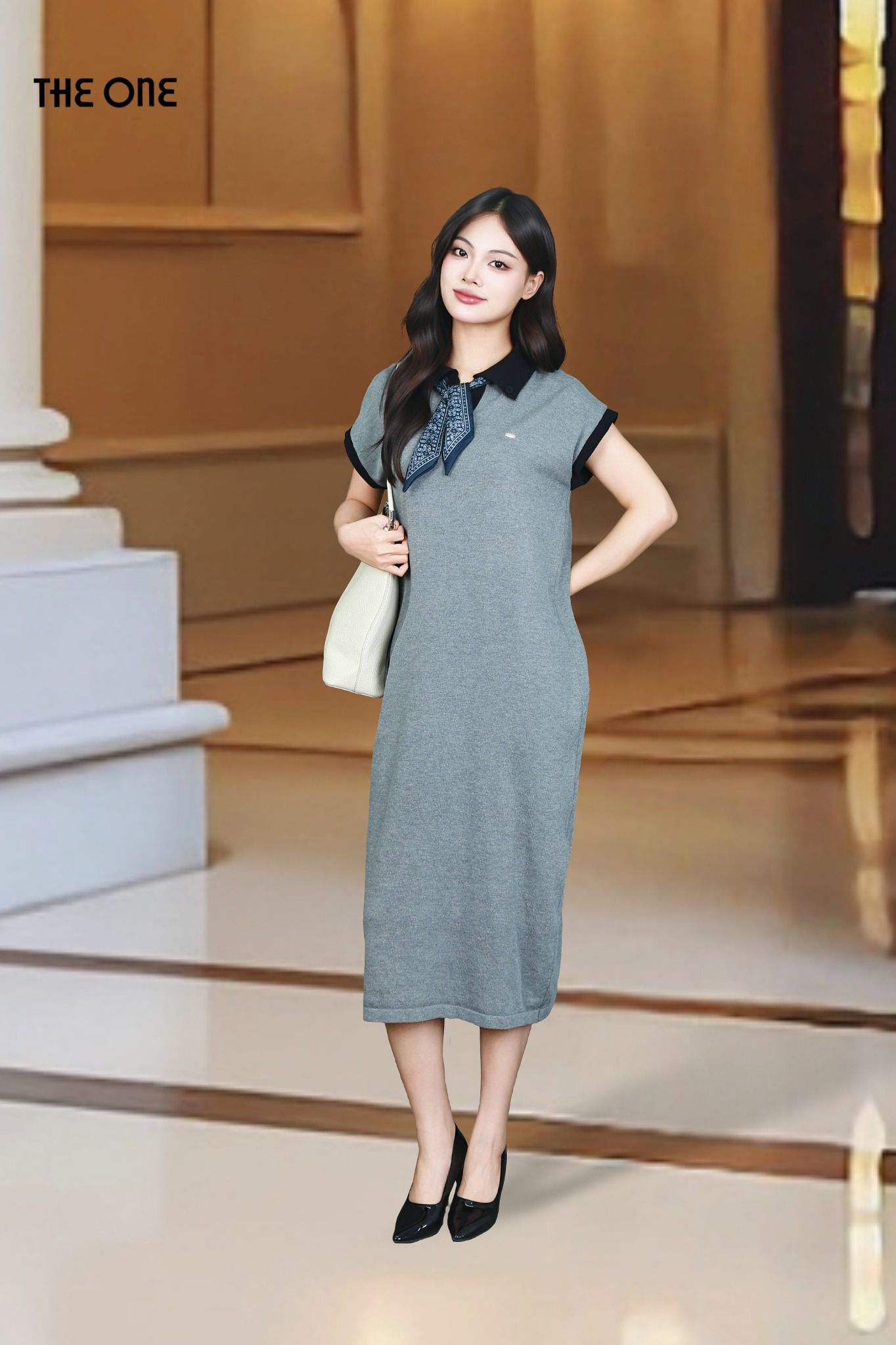 Đầm len tăm ghi suông tay liền cộc viền gấu đen cổ đức xẻ V đen khăn trang trí