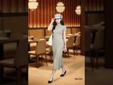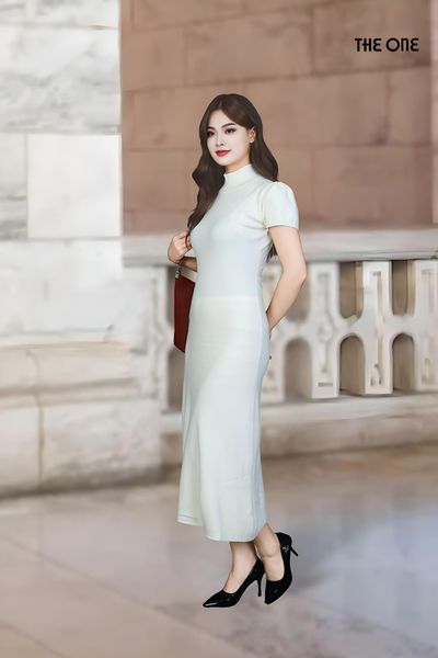 Đầm len tăm kem dáng ôm dài tay cộc vai bồng cổ 5F