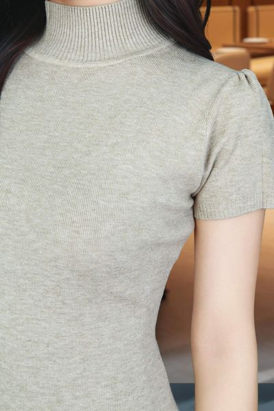 Đầm len tăm nâu dáng ôm dài tay cộc vai bồng cổ 5F