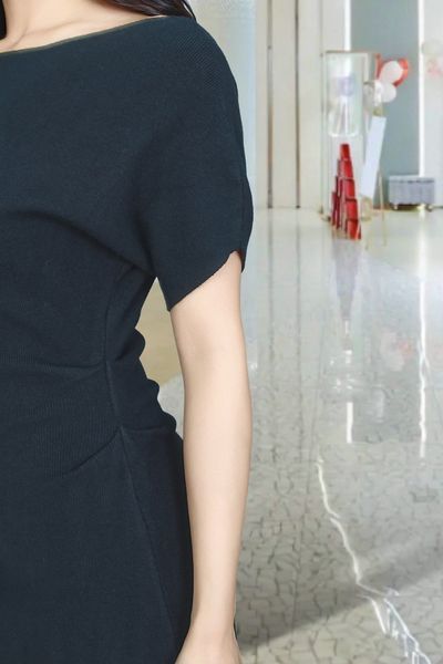 Đầm len tăm đen dáng A dài cổ thuyền tay cánh dơi nhún sườn