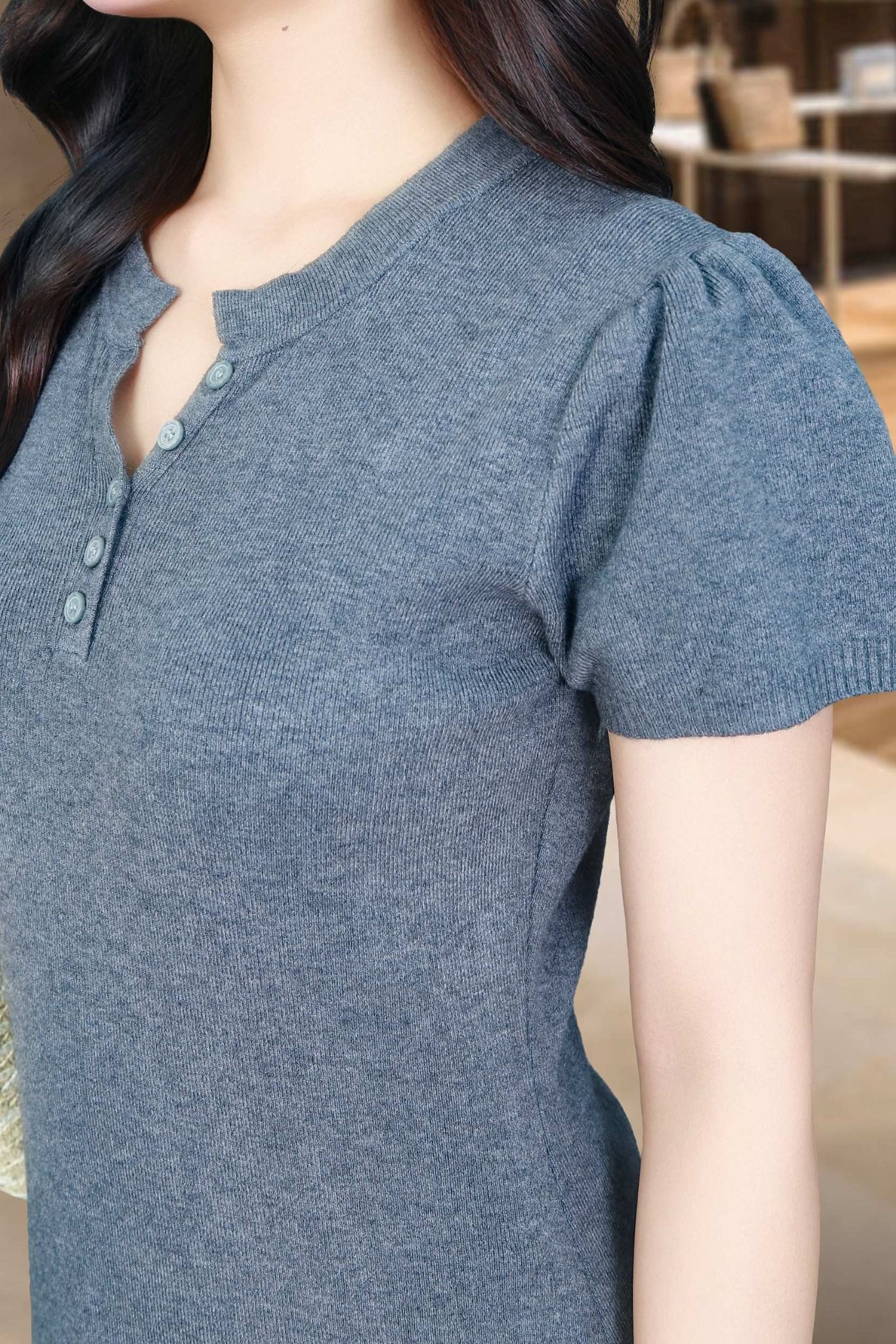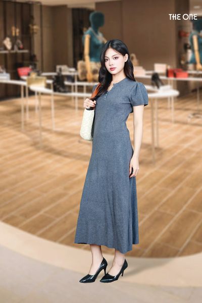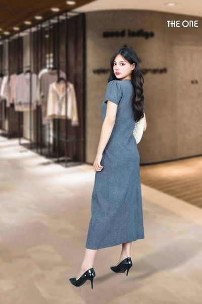 Đầm len tăm ghi đậm dáng dài tay cộc cổ tròn bổ trụ đính khuy