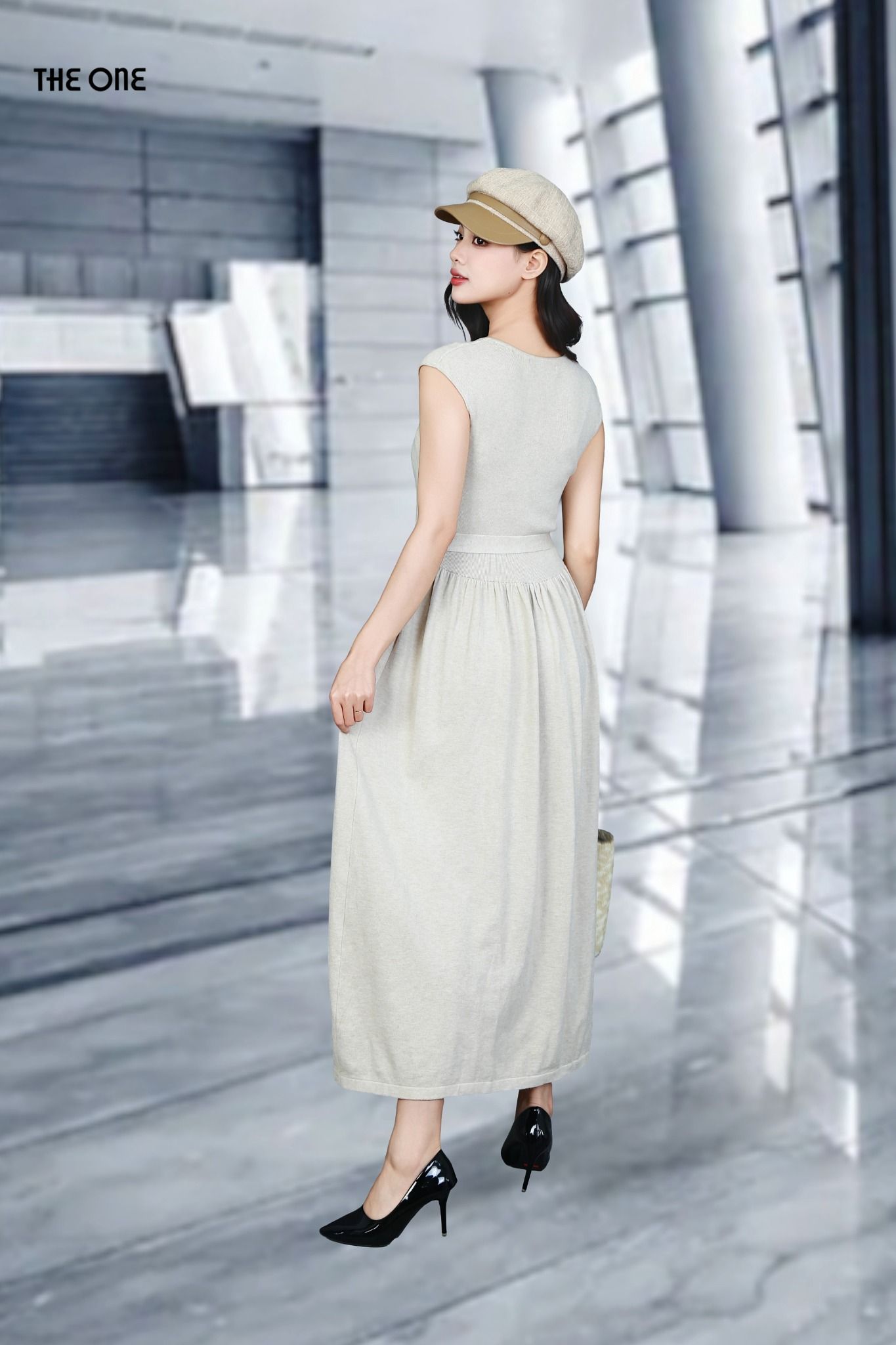 Đầm len be xòe sát nách tay chờm cổ tròn đai eo