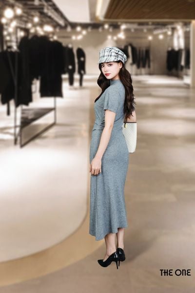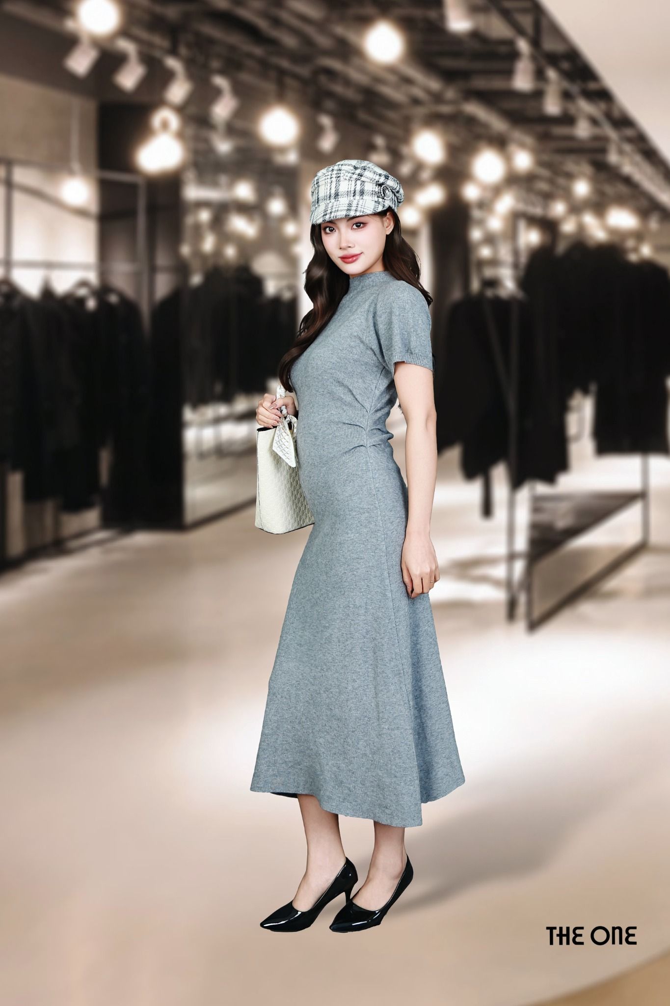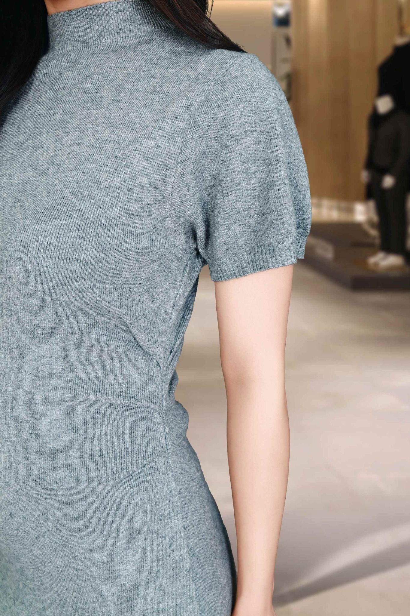 Đầm len tăm ghi ôm dài tay cộc cổ 3F nhún eo