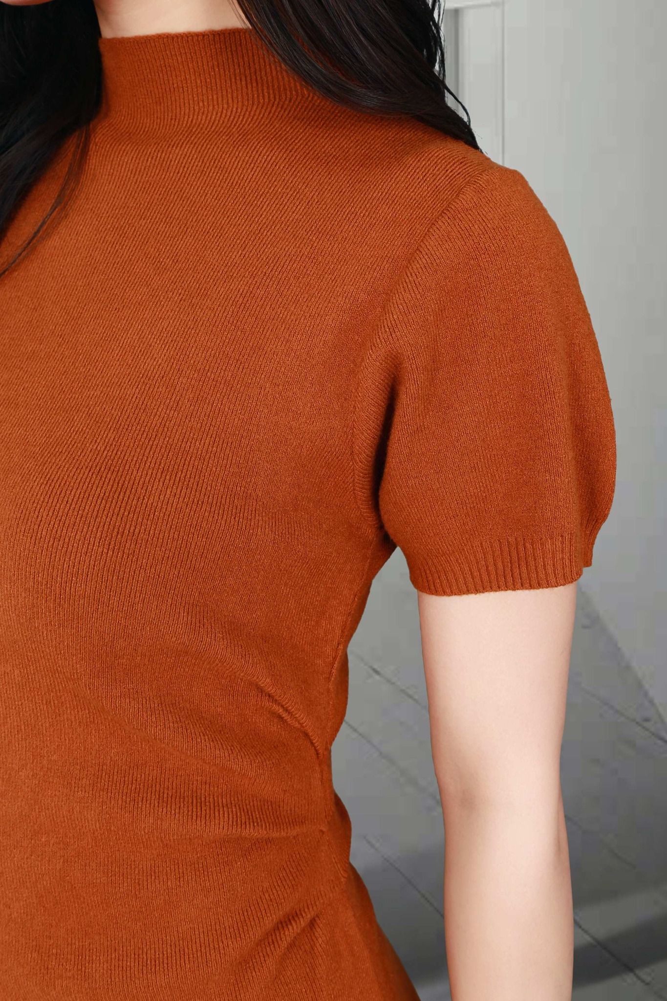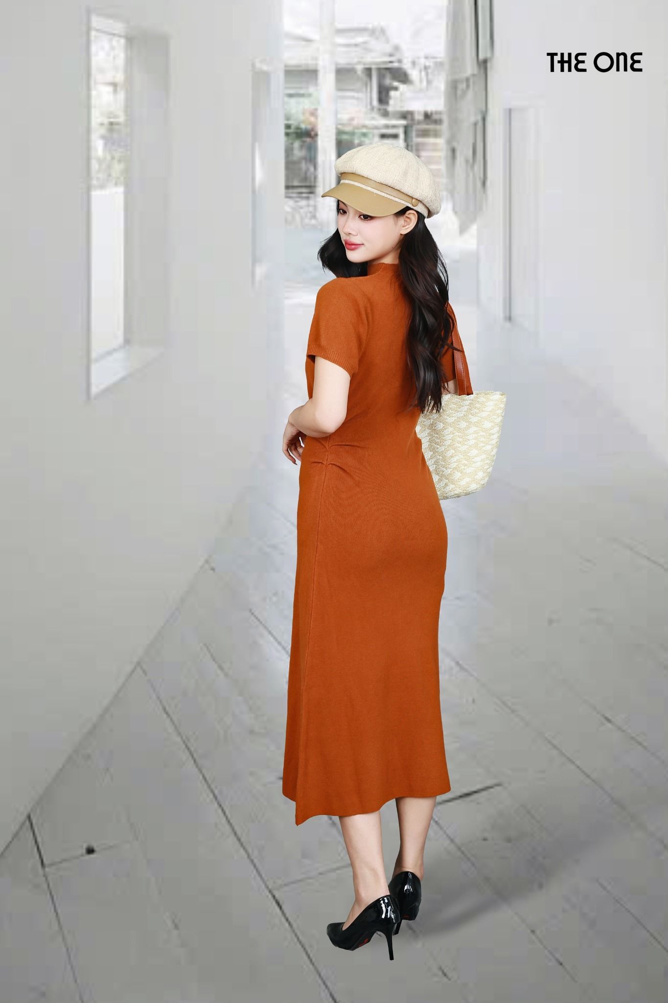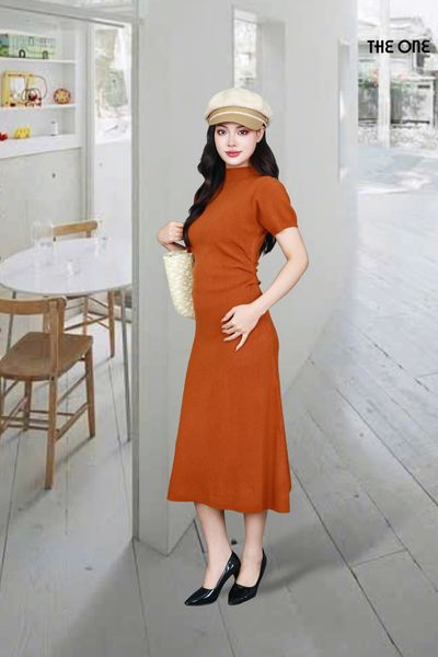 Đầm len tăm nâu vàng ôm dài tay cộc cổ 3F nhún eo