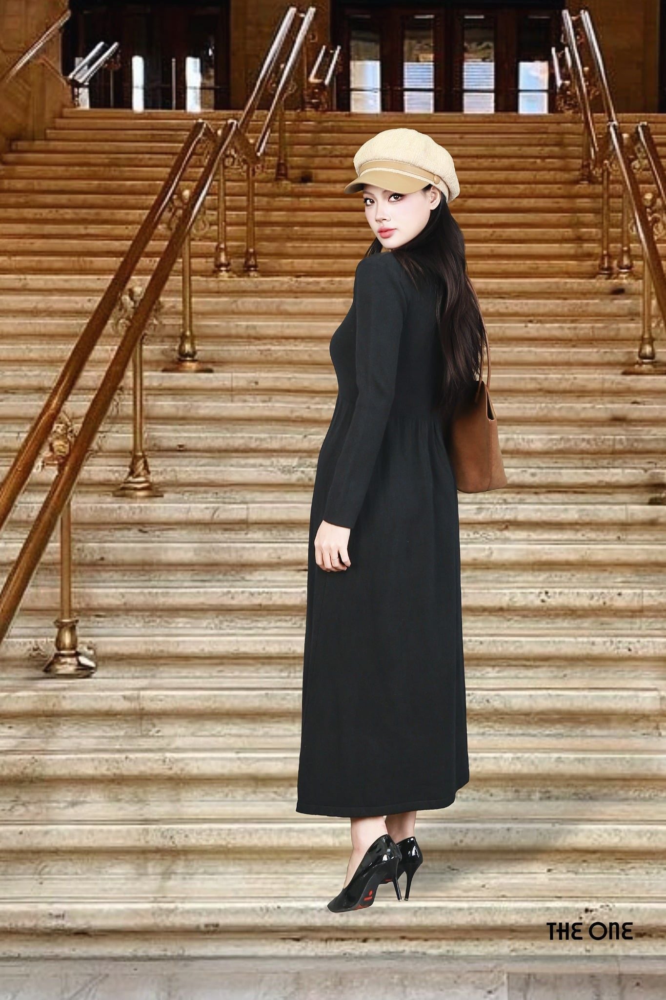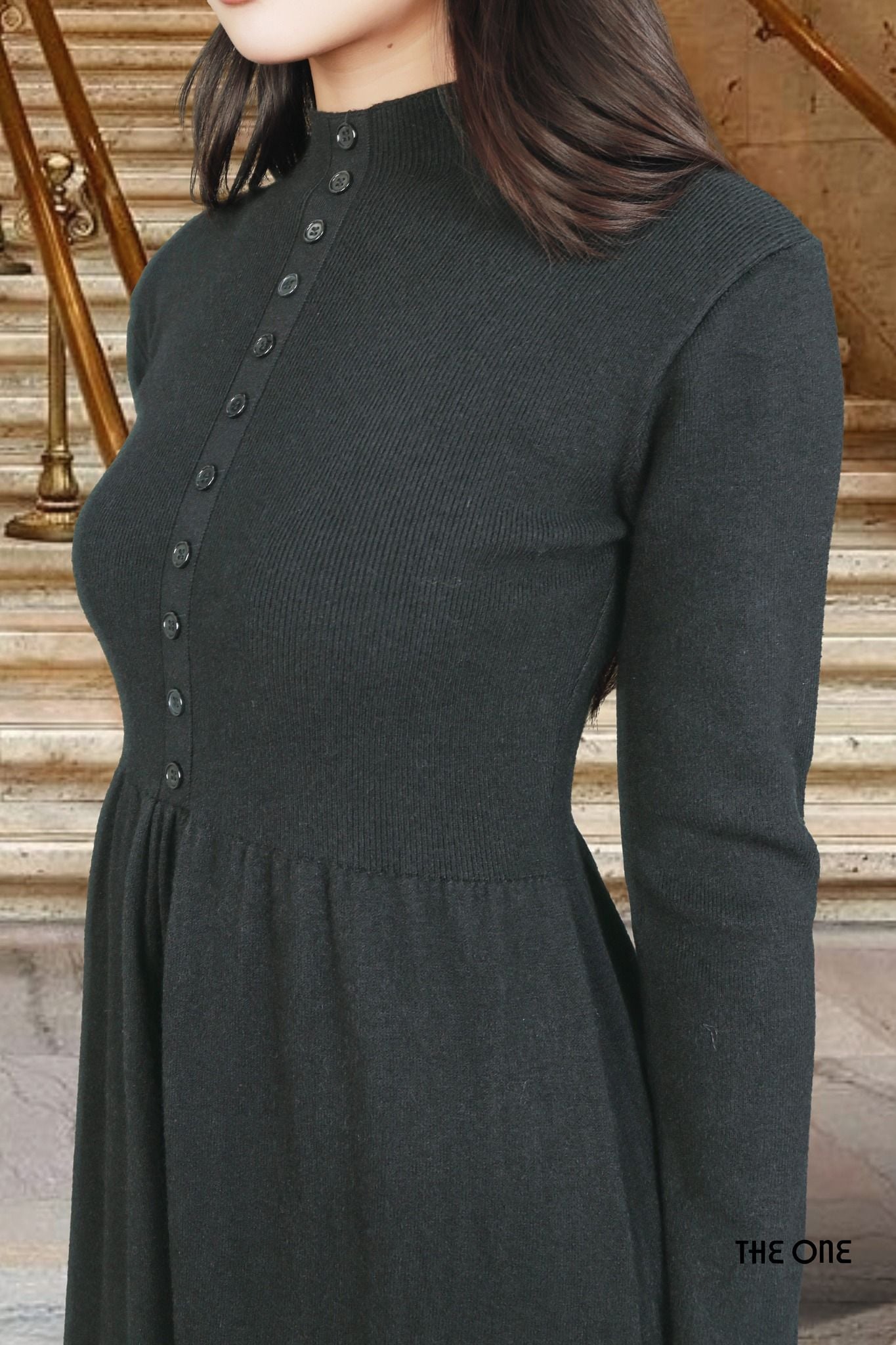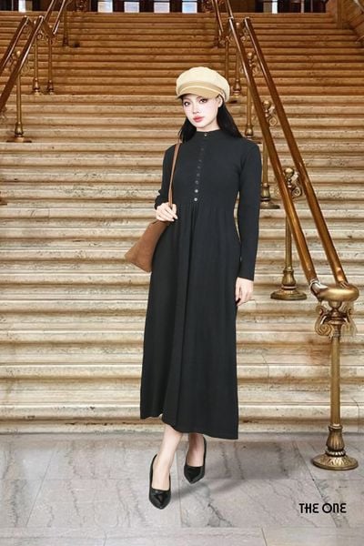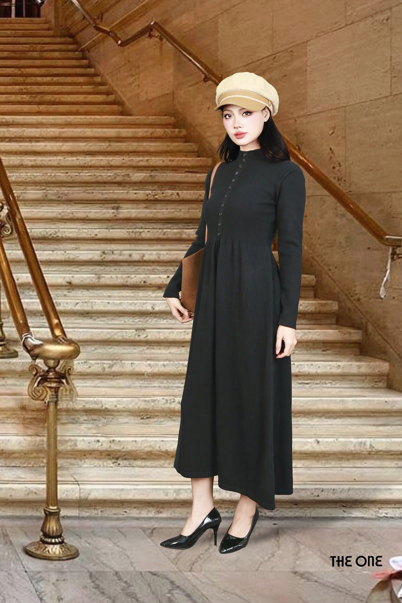 Đầm len đen cổ 3cm tay dài nẹp đính khuy chân xòe rủ