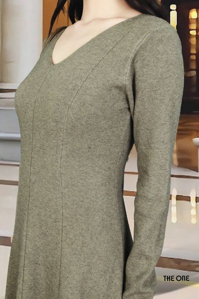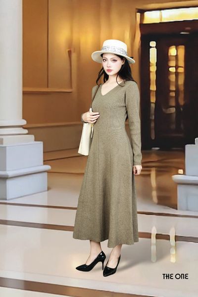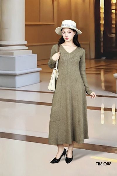 Đầm len nâu đậm tay dài dáng dài cổ tim 7 mảnh