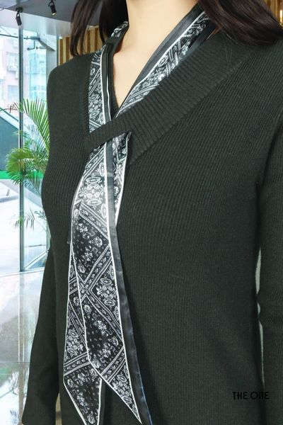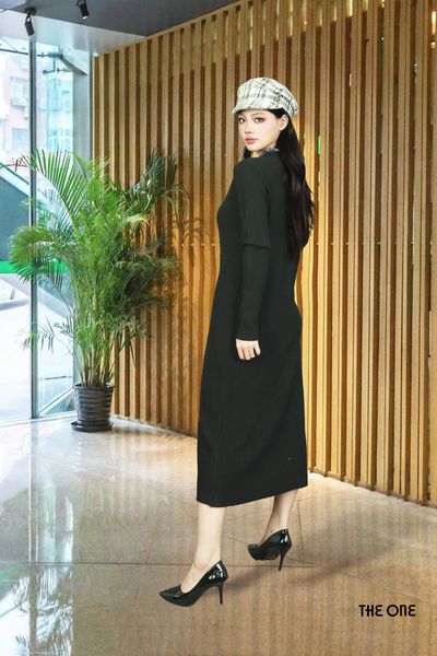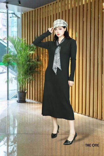 Đầm len tăm tay dài dáng dài đen cổ V khăn lụa