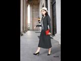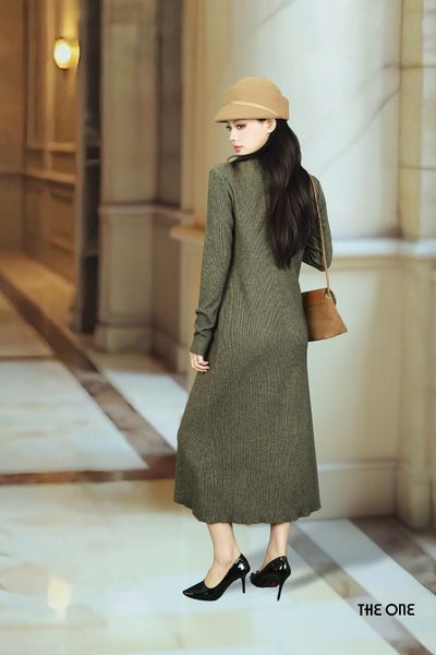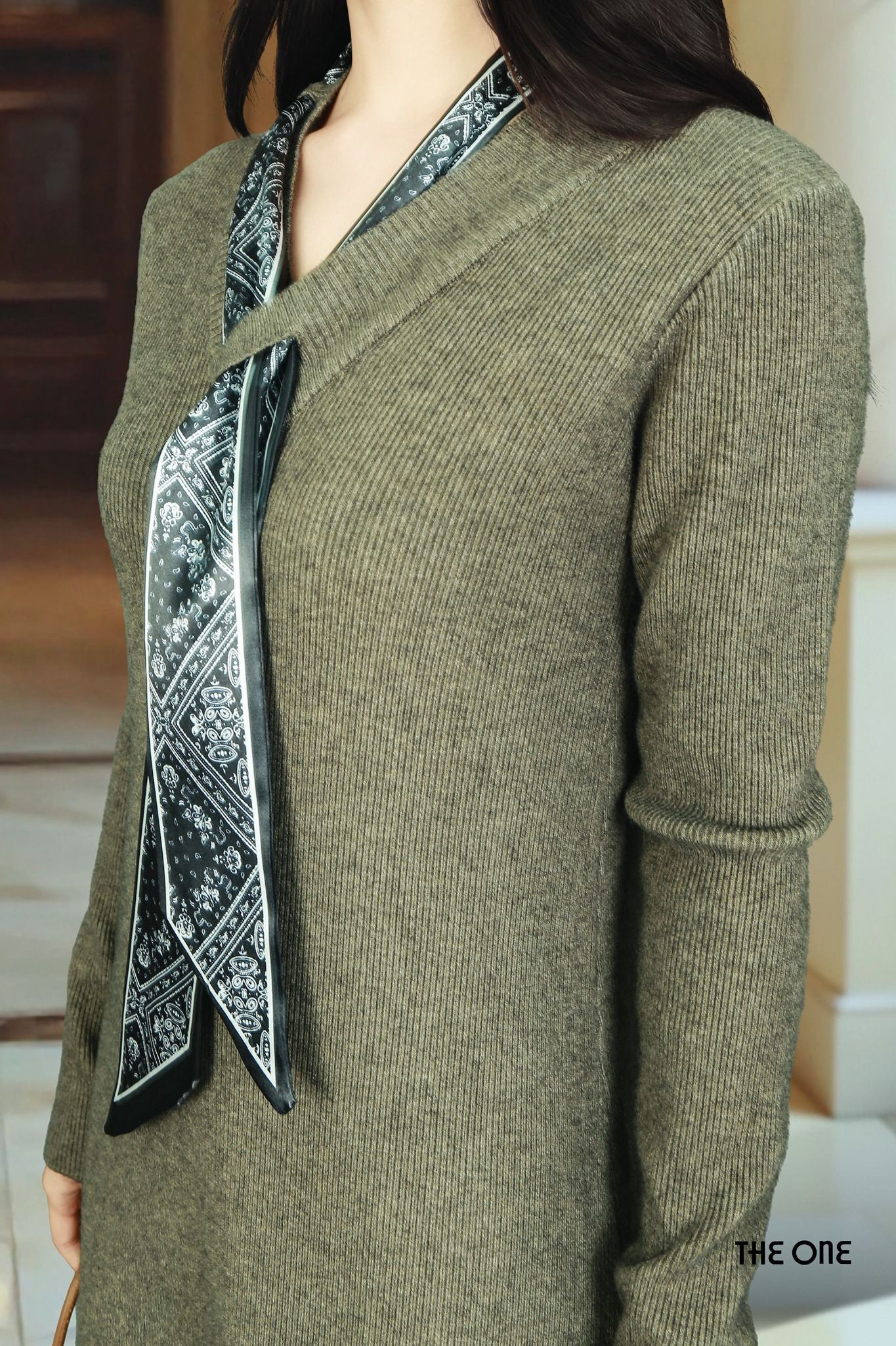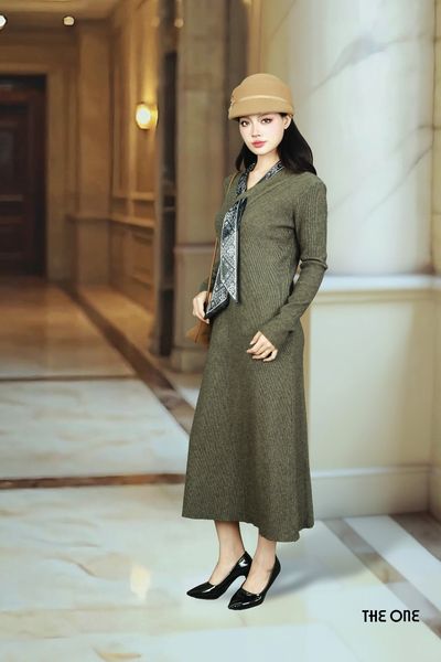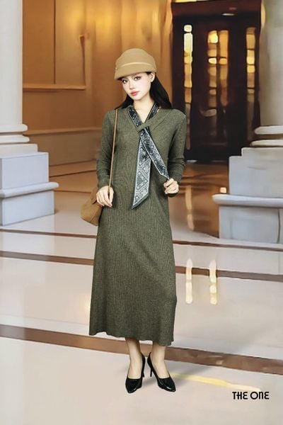 Đầm len tăm tay dài dáng dài nâu đậm cổ V khăn lụa
