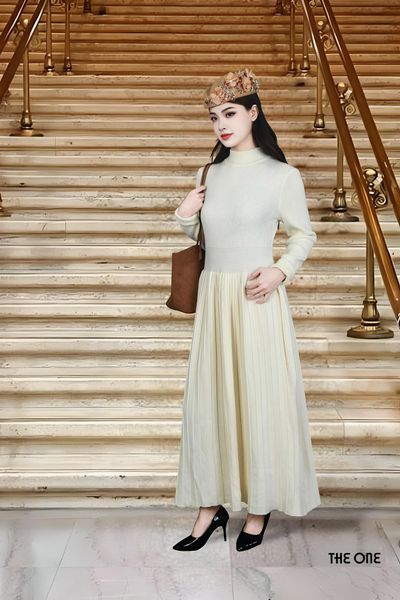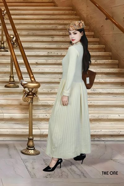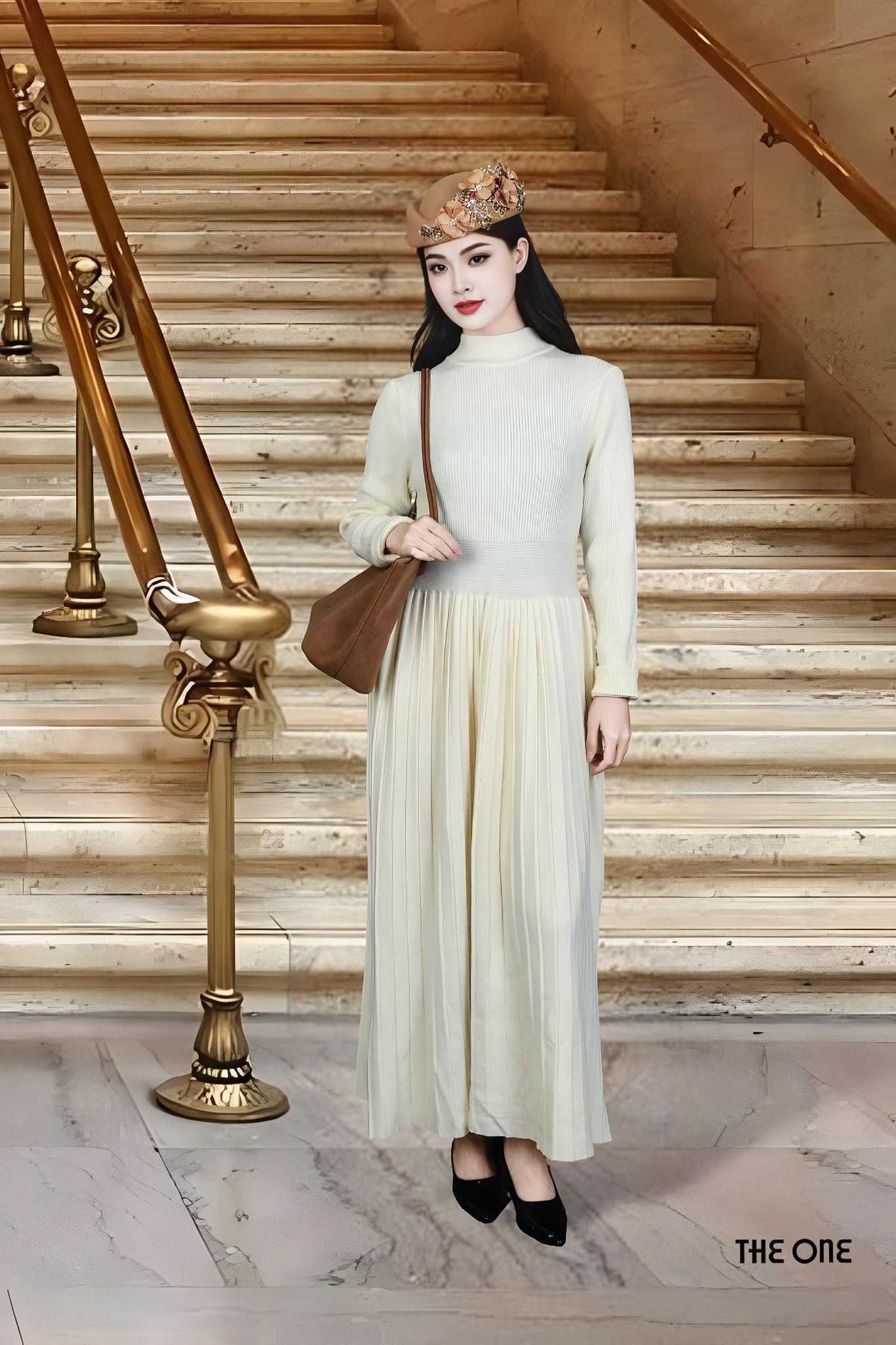 Đầm len tăm kem tay dài dáng dài cổ 5cm chân mí xòe