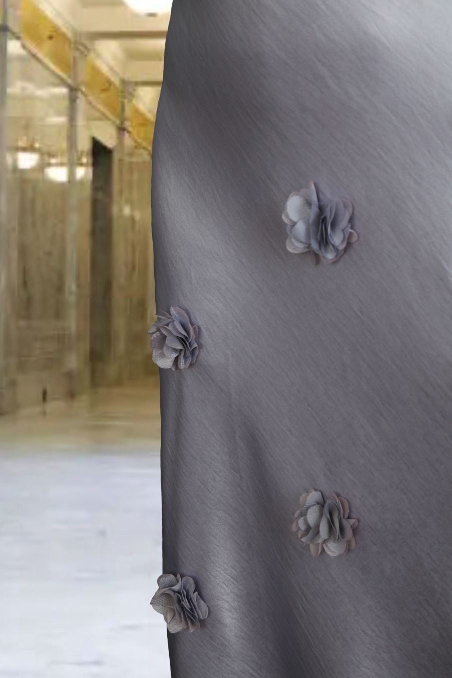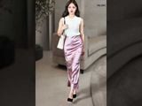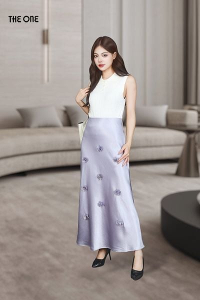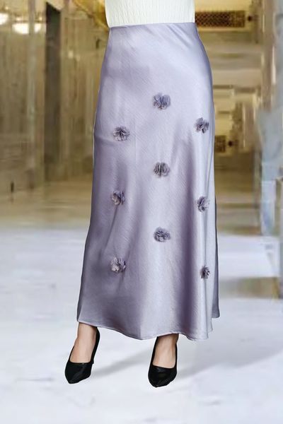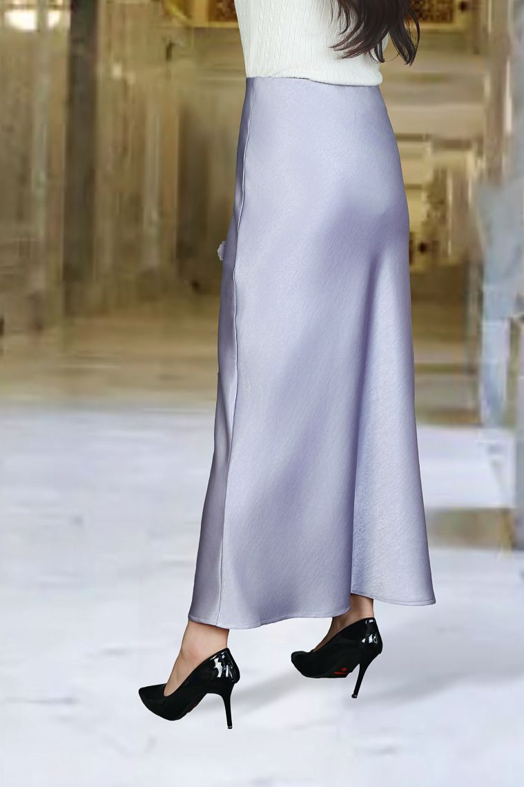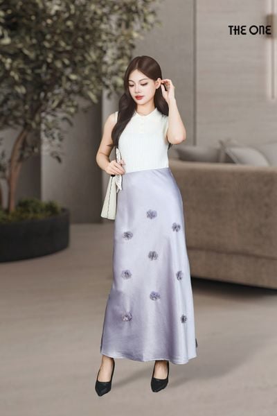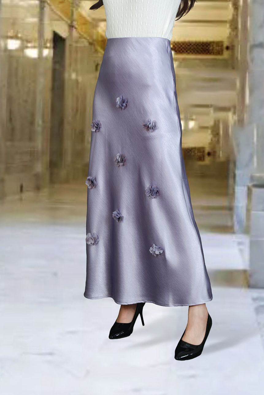 Chân váy Maxi 1 lớp dáng A lụa gấm tím nhạt đính hóa Laser cạp bản chun lật trong