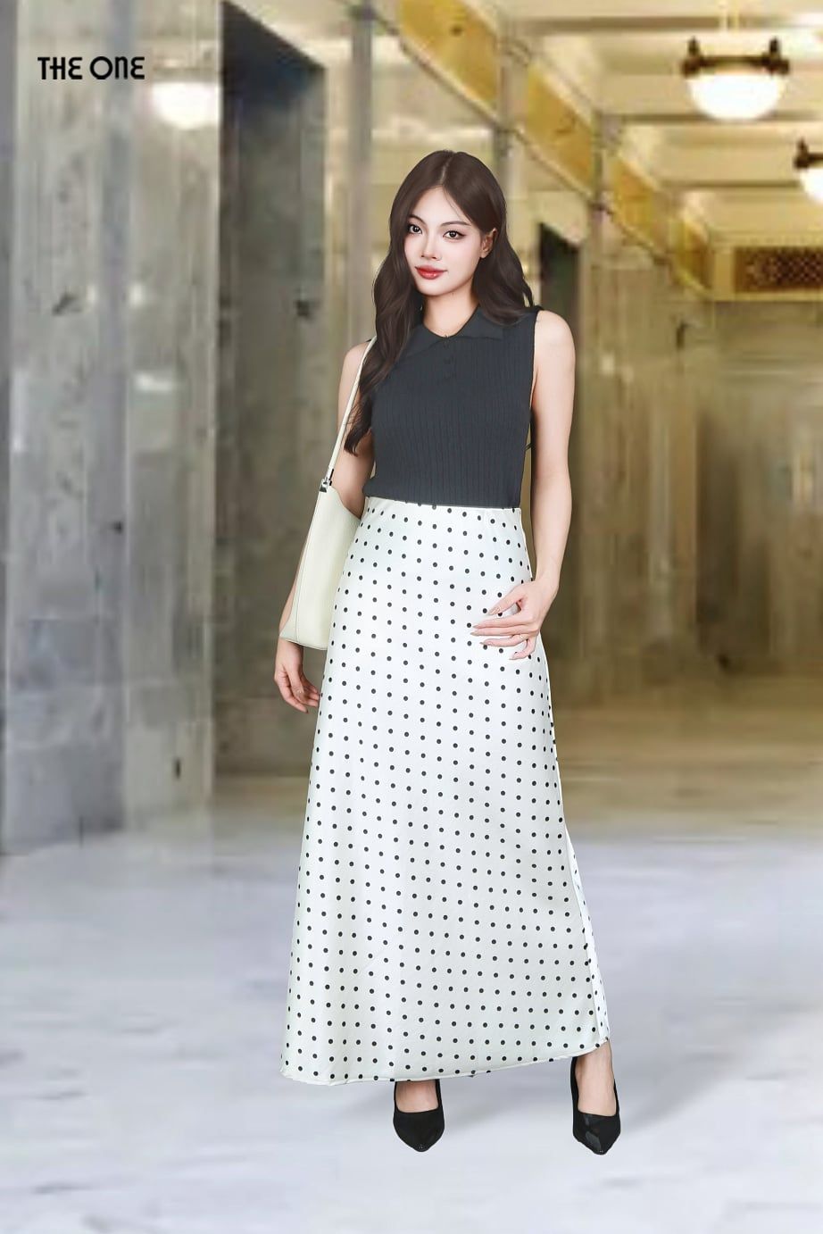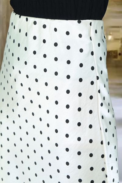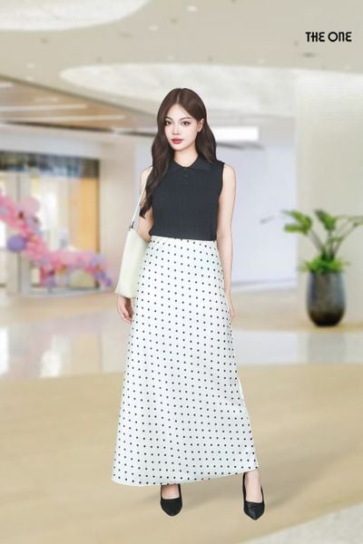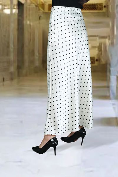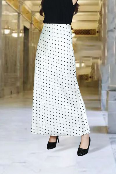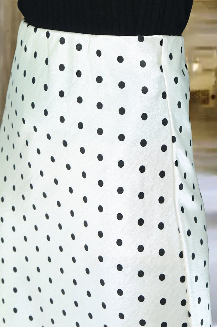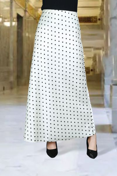 Chân váy Maxi 1 lớp dáng A lụa gấm kem chấm bi đen cạp bản chun lật trong