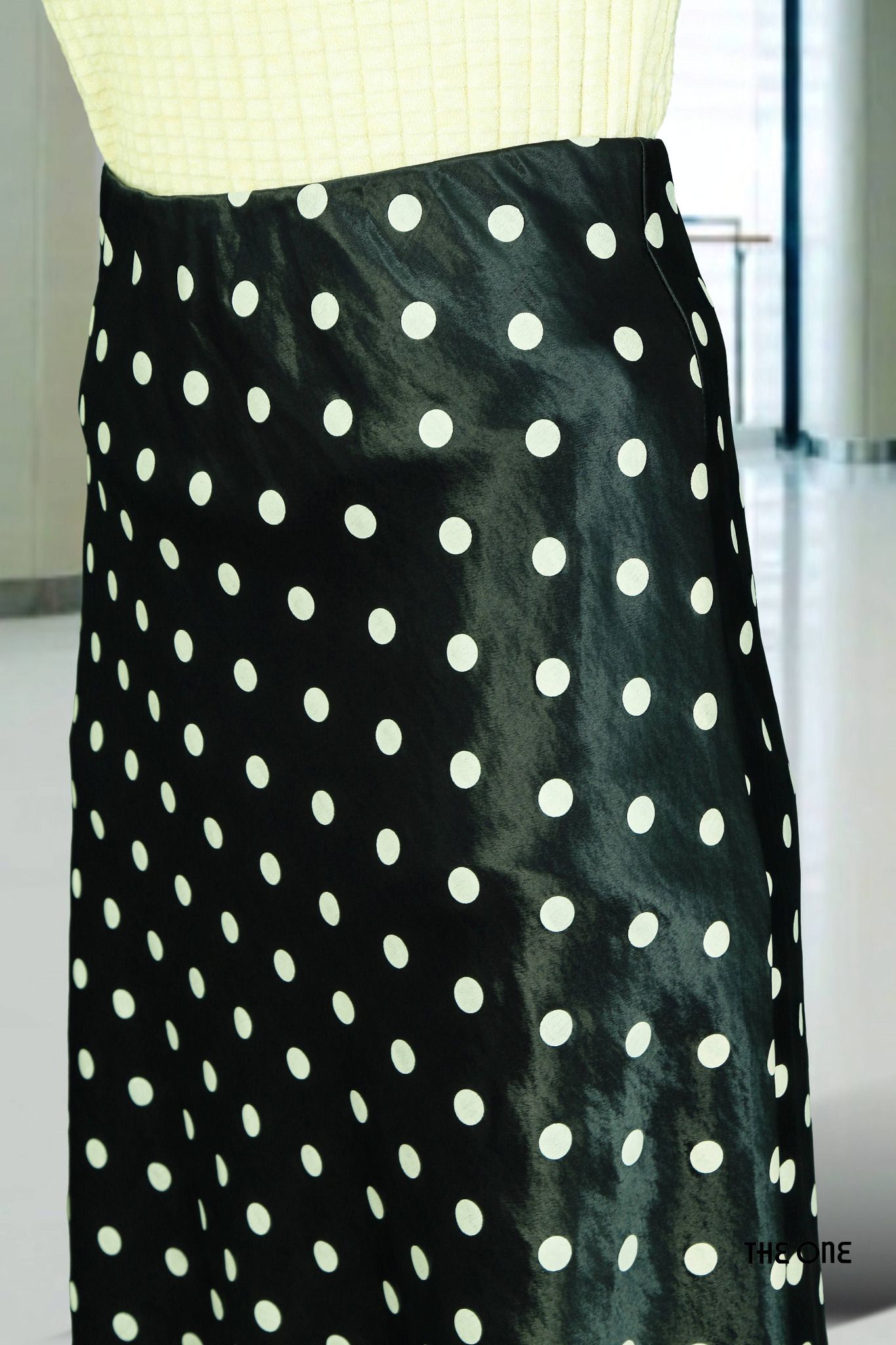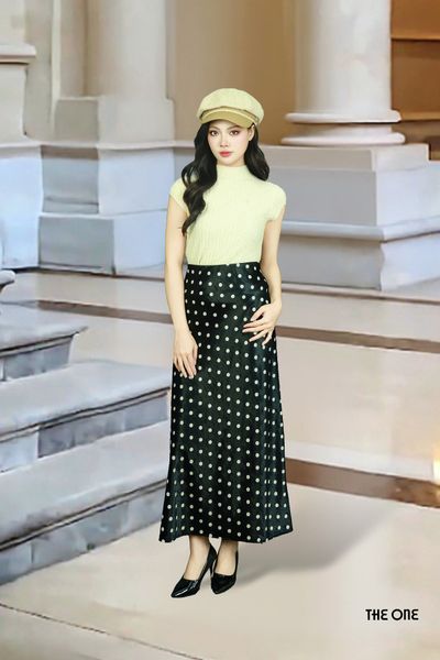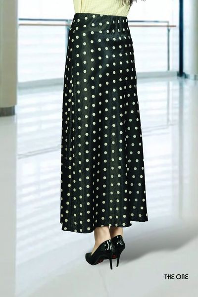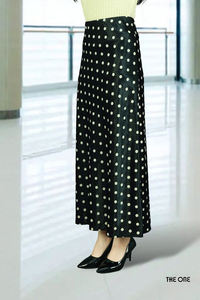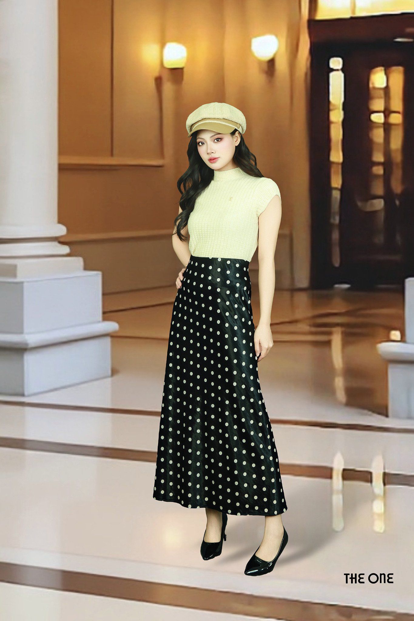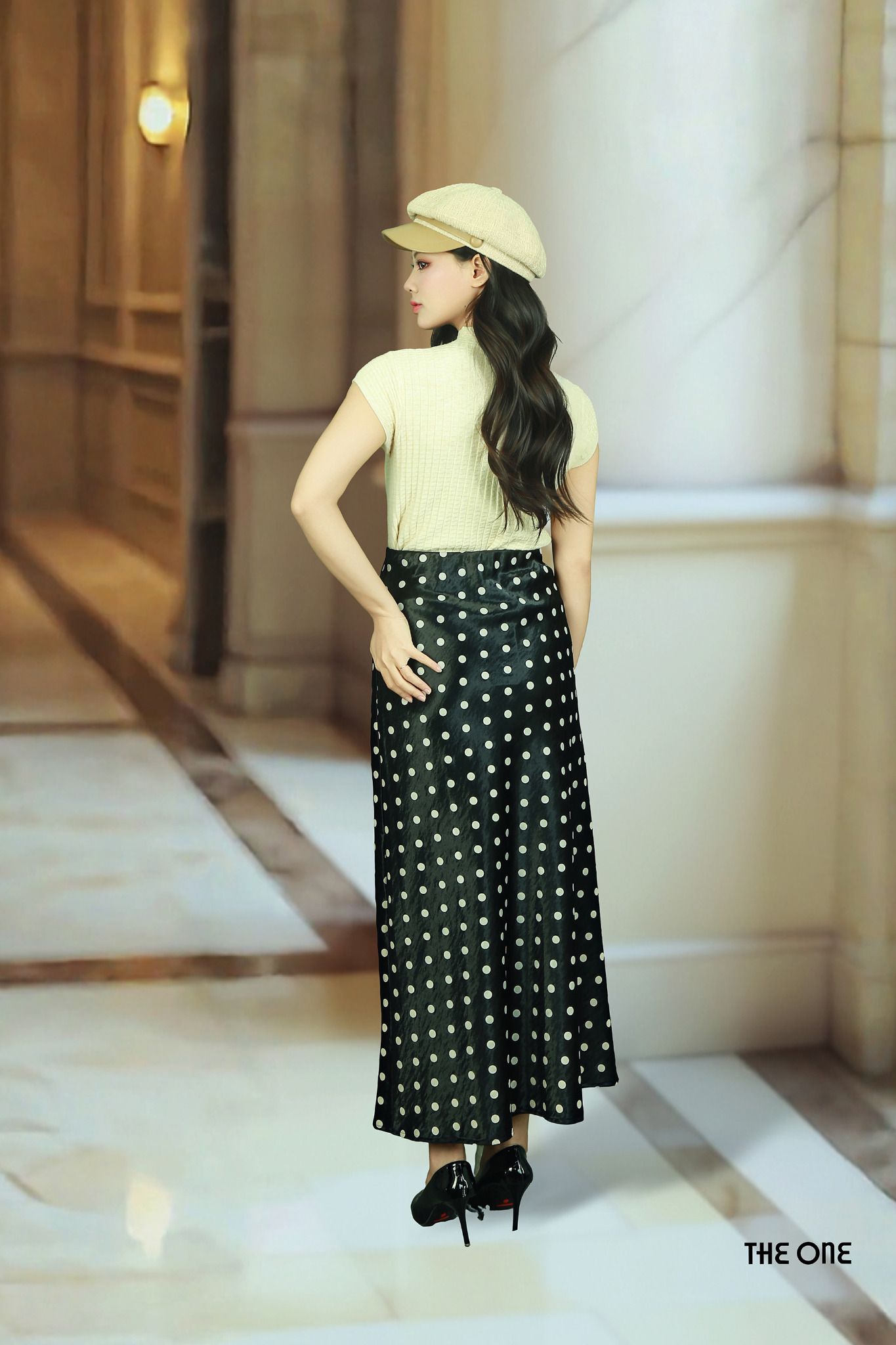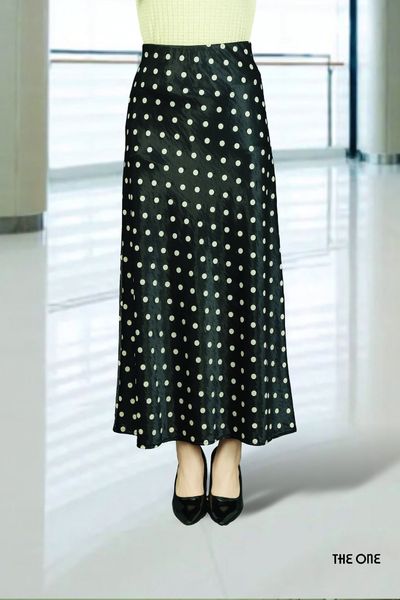 Chân váy Maxi 1 lớp dáng A lụa gấm đen chấm bi trắng to cạp bản chun lật trong
