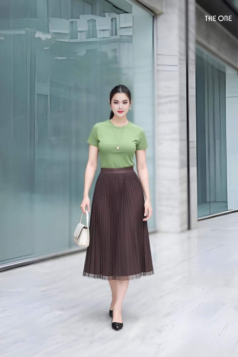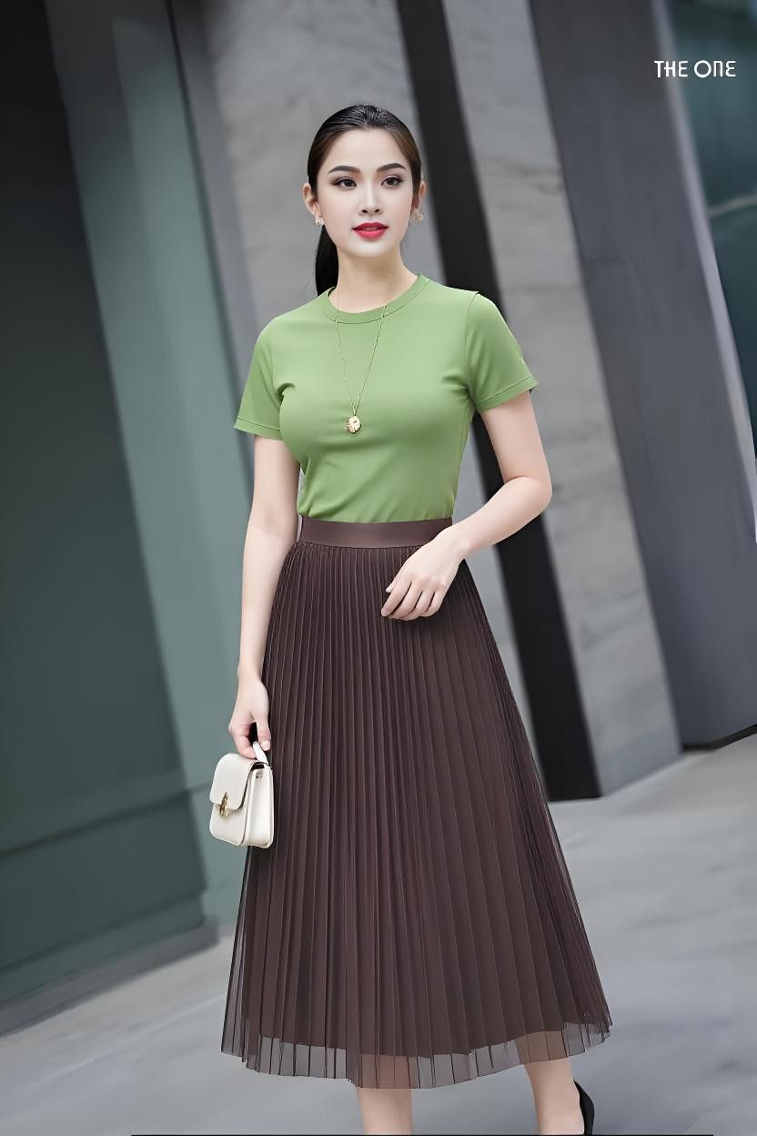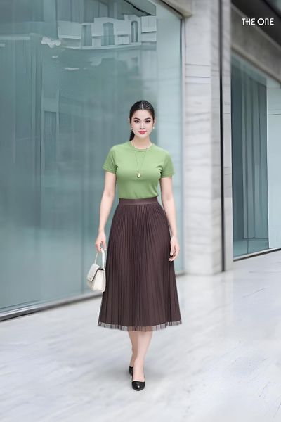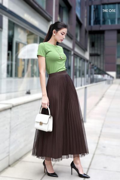 Chân váy 2 lớp cạp chun nâu xếp ly mặc 2 mặt